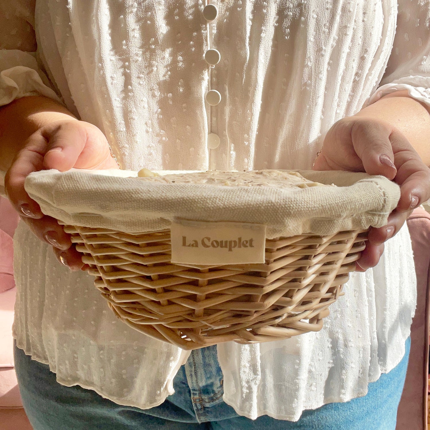 A round wicker proofing basket (also known as a banneton or brotform) is your sourdough’s comfy resting spot. A little nest where it gets to puff up, relax, and prepare for its big moment in the oven.